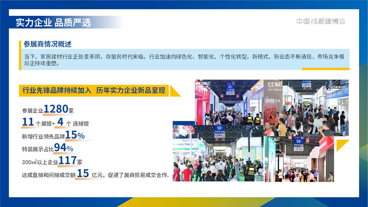 中国(成都)建筑及装饰材料博览会(简称:CCBD中国成都建博会)创办于2004年,是全球展览业协会(UFI)认证展会,展会规模已稳居中西部地区同类展会第一。CCBD中国成都建博会一直致力于为全国建材家居厂家、经销代理商、房地产开发商、建设/装饰单位提供专业的商贸合作渠道,重点布局"经销代理"和"公装集采"两大核心,同时积极开拓"旧房改造"和"出海贸易"创新业务领域。在深度把握成渝地区双城经济圈建设战略机遇,依托成渝地区的产业集群优势,2023年在重庆成功打造CCBD中国重庆建博会,形成了“成渝双展”4月成都10月重庆双城发展的新格局,平台资源整合优势更强。